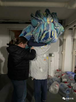 18号晚上八点左右,第一批床品供给送到宿舍厂区,TA们便扛起整个宿舍的物资份量,默默为其他人送去温暖。